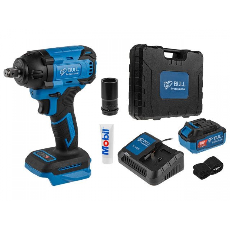 0329179 Зарядное устройство BULL LD 4002; Компактный гайковерт отличается высоким крутящим моментом 400 Н·м, возможностью использования в местах без электроснабжения. Модель имеет бесщеточный двигатель, что способствует повышенной устойчивости к нагрузкам, обеспечивает легкость инструмента, простоту в его обслуживании. Для точности в работе гайковерт оснащен трехуровневой электронной регулировкой оборотов. Удобству пользователя способствует индикатор уровня заряда, подсветка, обрезиненная рукоятка. А наличие предохранительной муфты и функции защиты от перегрузки значительно продлит срок службы инструмента.