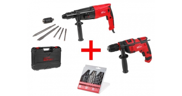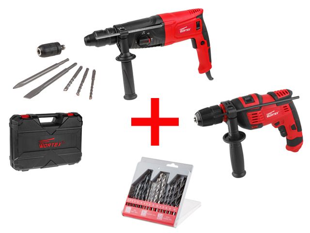 Перфоратор WORTEX RH 2629 в чем. + (2 зубила, 3 сверла) + АКЦИЯ! (+Дрель ударная WORTEX DS 1308 в кор. со скидкой + Набор сверл универсальный 16 шт. W