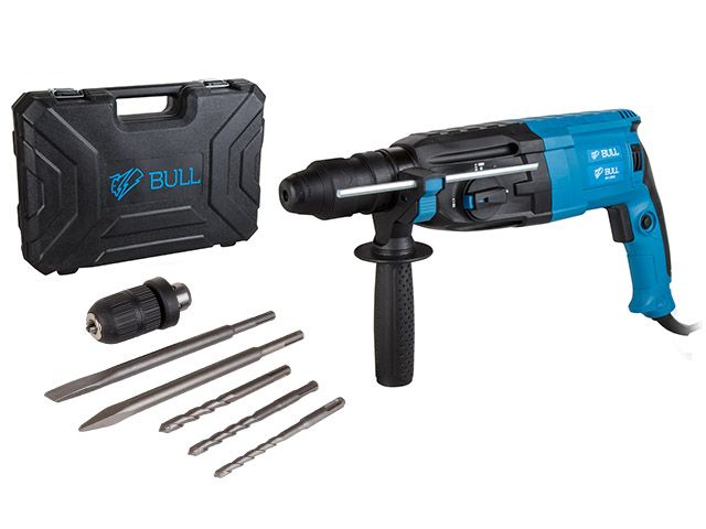 Перфоратор BULL BH 2602 в чем. 800 Вт, 3.0 Дж, 4 реж. + 2 зубила, 3 сверла, БЗП в комплекте (800 Вт, 3.0 Дж, 4 реж., патрон SDS-plus, БЗП в комплекте,