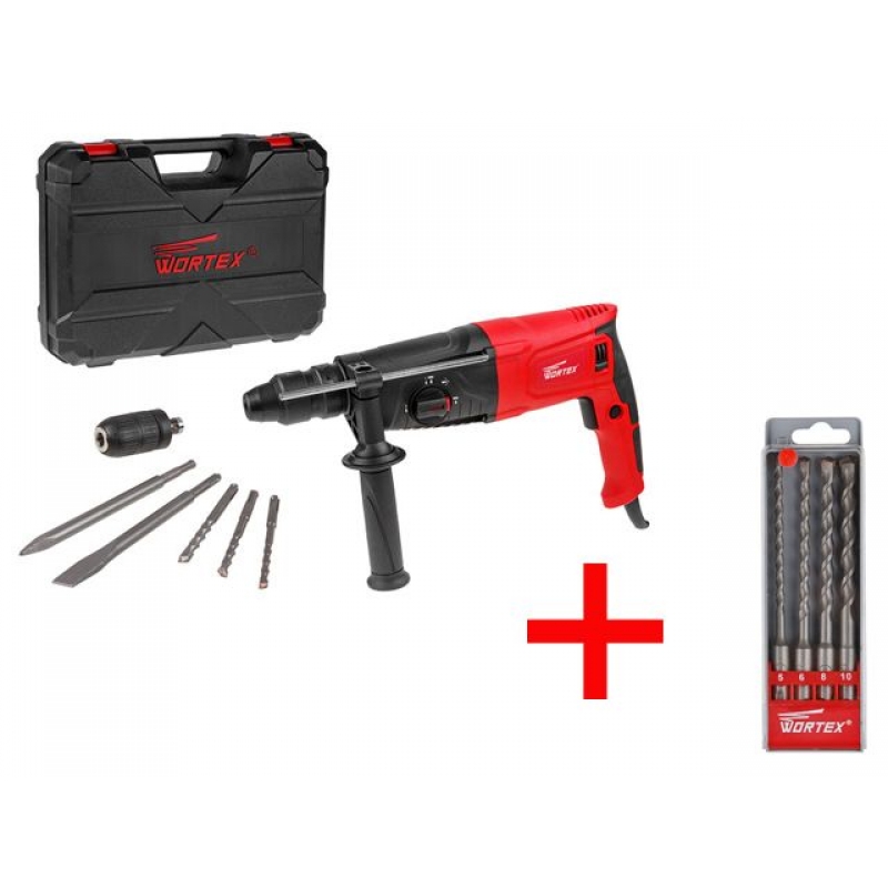 Гарантийный срок - 2 года. Набор буров (сверл) SDS-plus 4 шт. WORTEX в ПОДАРОК!