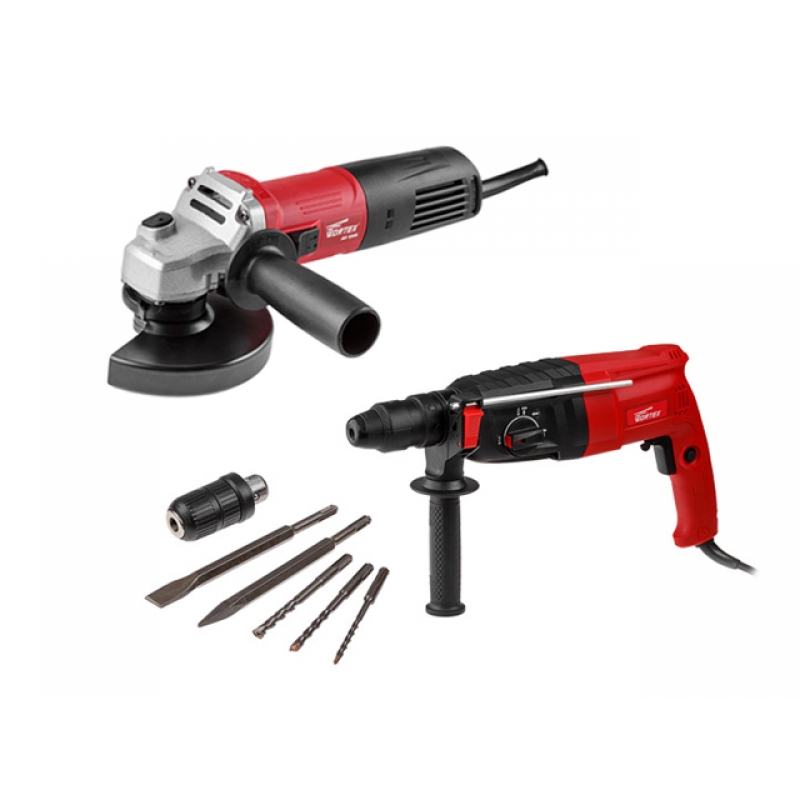 Перфоратор входящий в комплект имееет высокую скорость при сверлении и высокую производительность при долблении благодаря двигателю в 900 Вт и энергии удара 3,2Дж. 3 Вида работы - сверление, сверление с ударом, долбление. Также имеется функция регулировки угла оснастки, реверс. Быстрорегулируемая эргономичная рукоятка легко настраивается в любом нужном положении. Патрон SDS+.