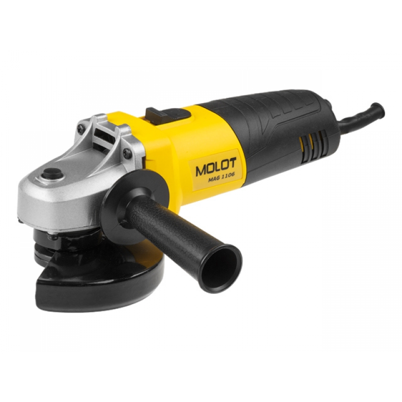 УШМ имеет прочный и удобный корпус, устойчивый к повреждениям, игольчатый подшипник, лакированный ротор, блокировку шпинделя, удобную кнопку включения.