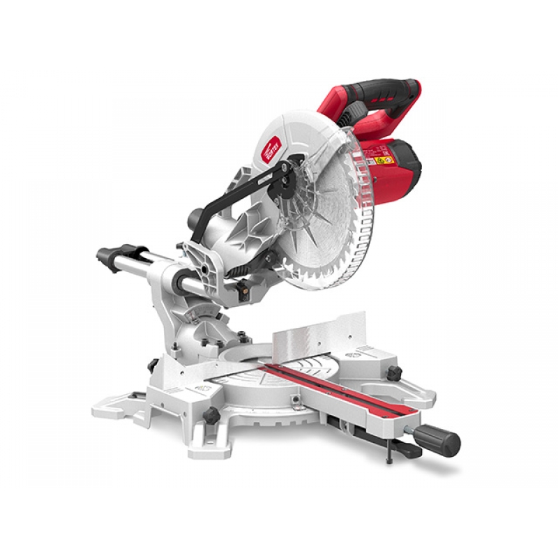 На пиле установлен мощный двигатель c высокой производительностью, имеется система пылеудаления, лазерный указатель для более точного реза, металлические скользящие полозья, плавный ход реза, система удобного зажима заготовки, точный рез, Быстрая регулировка глубины и ширины реза.