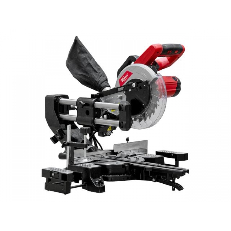 Торцовочная пила консольного типа, конкурентное преимущество которой заключается в том, что консольная конструкция позволяет производить более длинный распил при меньшем диаметре режущей кромки. Пила отличается наличием мощного 1800 Вт двигателя c высокой производительностью, имеется система пылеудаления, лазерный указатель для более точного реза, металлические скользящие полозья, плавный ход реза, система удобного зажима заготовки, точный рез, Быстрая регулировка глубины и ширины реза. А так же наличие ребер жесткости в основании придает дополнительную мощность конструкции, что очень важно для торцовочной пилы.