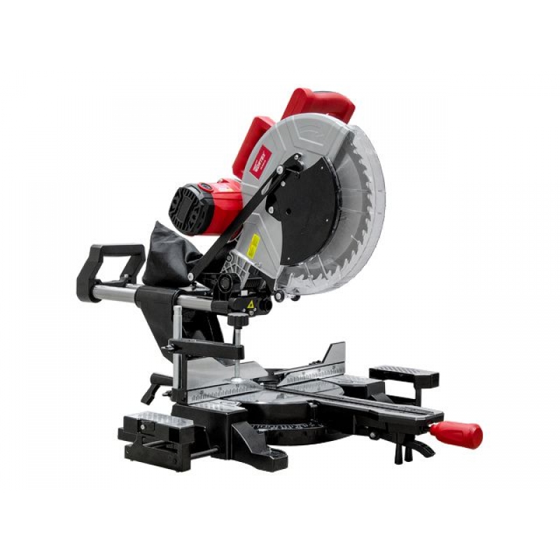 На пиле установлен мощный двигатель с ременной передачей, что в свою очередь делает его более надежным и менее шумным, имеется система пылеудаления, лазерный указатель для более точного реза, металлические скользящие полозья, плавный ход реза, система быстрого зажима заготовки, точный рез. Быстрая регулировка глубины и ширины реза. Правый/левый наклон пильной головы. А так же наличие ребер жесткости в основании придает дополнительную мощность конструкции, что очень важно для торцовочной пилы.