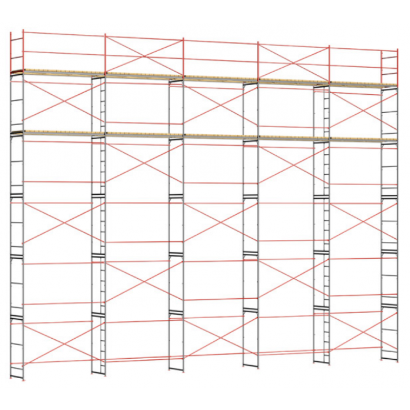 Рамные леса беспрепятственно выдерживают груз весом до 200 килограмм. Каждый элемент надежно закреплен прочным фиксатором, кроме того леса можно регулировать, как по высоте, так и по ширине. При необходимости возможна комплектация лесов несколькими ярусами.