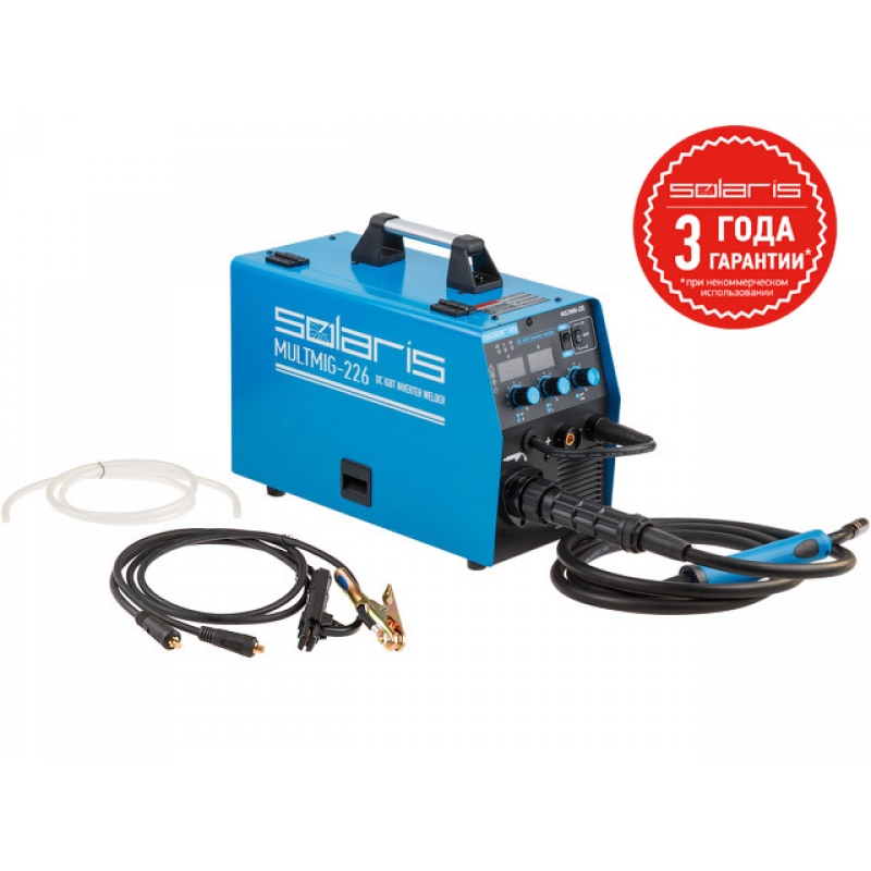 Инверторный сварочный аппарат, позволяющий варить в режиме полуавтоматической MIG/MAG/FLUX и в режиме ручной дуговой (ММА) сварки. Аппарат оснащен евроразъемом для горелки, возможностью смены полярности для сварки проволокой без газа (FLUX). Аппарат построен с использованием IGBT-транзисторов, обладает набором функций HOT START, ANTISTICK; имеет защиту от перегрева, перегрузки.