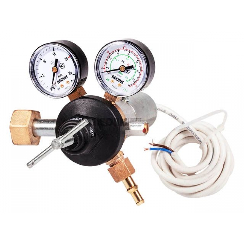 Регулятор расхода баллонный одноступенчатый предназначен для понижения и регулирования давления углекислого газа или аргона, поступающего из баллона, и автоматического поддержания постоянного рабочего расхода газа на выходе регулятора в ходе проведения работ. Подогреватель используется для предотвращения замерзания механизмов редуктора при больших расходах газа или при низких температурах окружающей среды. Подогрев осуществляется за счет теплообмена между газом и горячими стенками корпуса подогревателя.