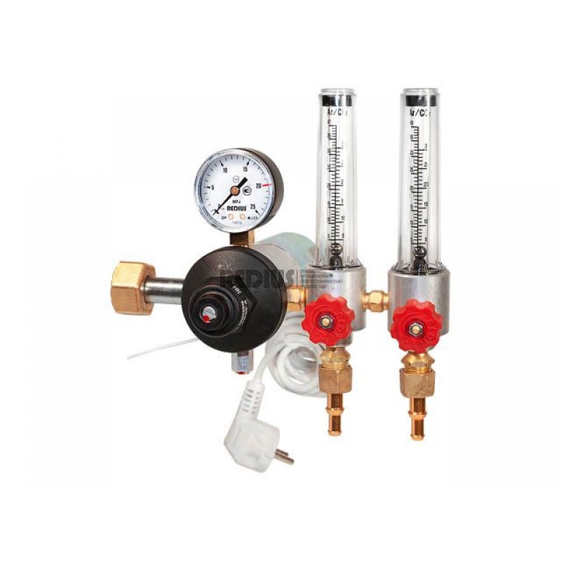 Регулятор расхода баллонный одноступенчатый предназначен для понижения и регулирования давления углекислого газа или аргона, поступающего из баллона, и автоматического поддержания постоянного рабочего расхода газа на выходе регулятора в ходе проведения работ. Подогреватель используется для предотвращения замерзания механизмов редуктора при больших расходах газа или при низких температурах окружающей среды. Подогрев осуществляется за счет теплообмена между газом и горячими стенками корпуса подогревателя.