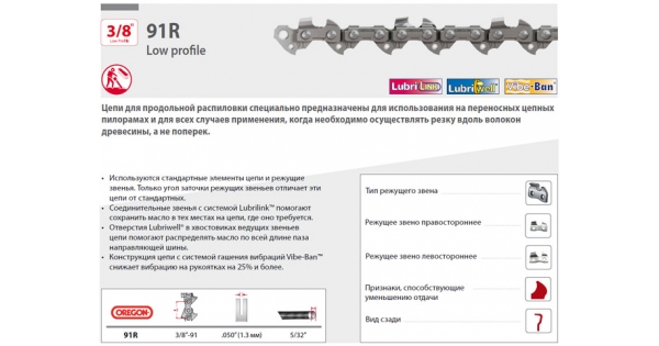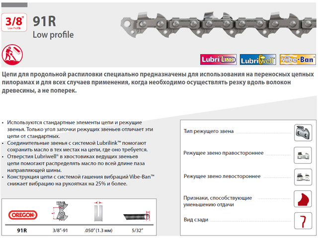 Цепь 35 см 14" 3/8" LP 1.3 мм 52 зв. для продольного пиления 91R OREGON (УСТАРЕЛА!)