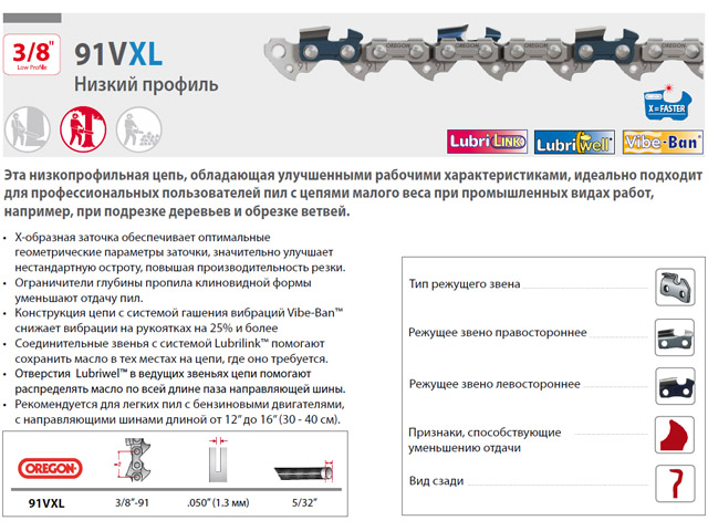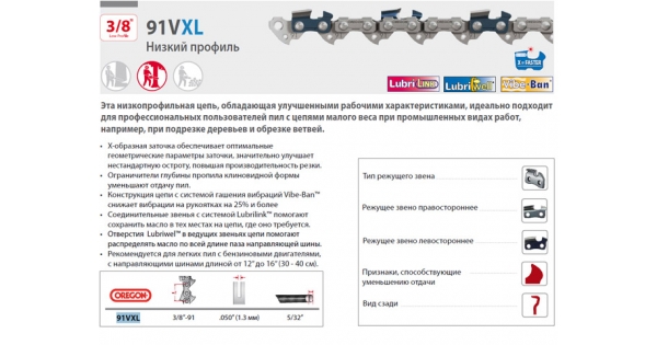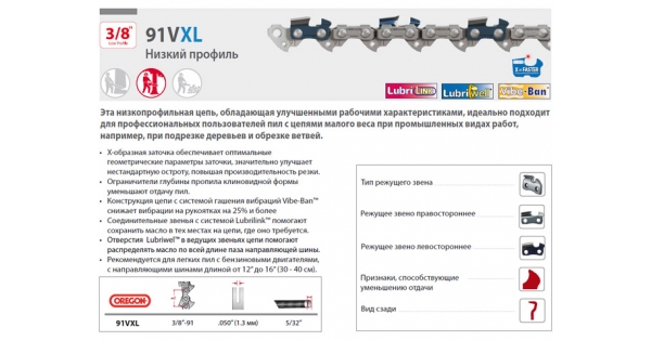 Цепь 35 см 14" 3/8" LP 1.3 мм 50 зв. 91VXL (2 шт в блистере) OREGON (затачиваются напильником 4.0 мм, для нерегулярн. интенсивного использования)