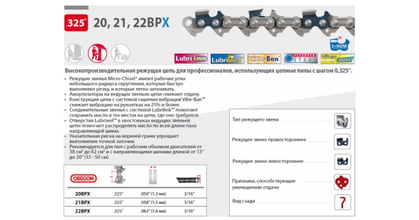 Цепь 38 см 15" 0.325" 1.3 мм 64 зв. 20LPX OREGON (затачиваются напильником 4.8 мм, для проф. интенсивного использования)