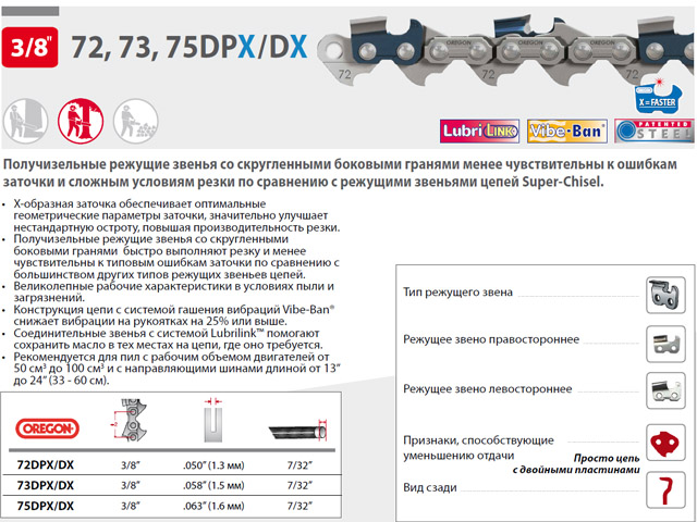 Цепь 40 см 16" 3/8" 1.6 мм 60 зв. 75DPX (в блистере) OREGON (затачиваются напильником 5.5 мм, для проф. интенсивного использования)