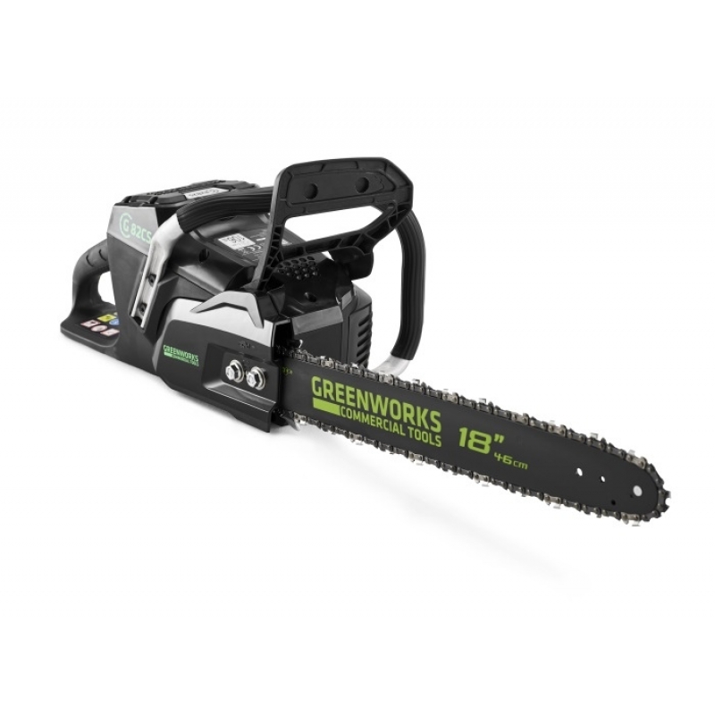 Аккумуляторная цепная пила GreenWorks 82V Commercial (модель GD82CS45). Это профессиональная модель для ведения лесного хозяйства. Оснащена бесщёточным электродвигателем DigiPro. Двигатель DigiPro эффективнее и надежнее обычного щёточного. По мощности сопоставим с двигателем внутреннего сгорания (~3 л.с, ~45 куб/см). При этом абсолютно экологичен. Не требует дополнительного обслуживания. Прост в эксплуатации. Имеет пониженный уровень вибраций и шума.