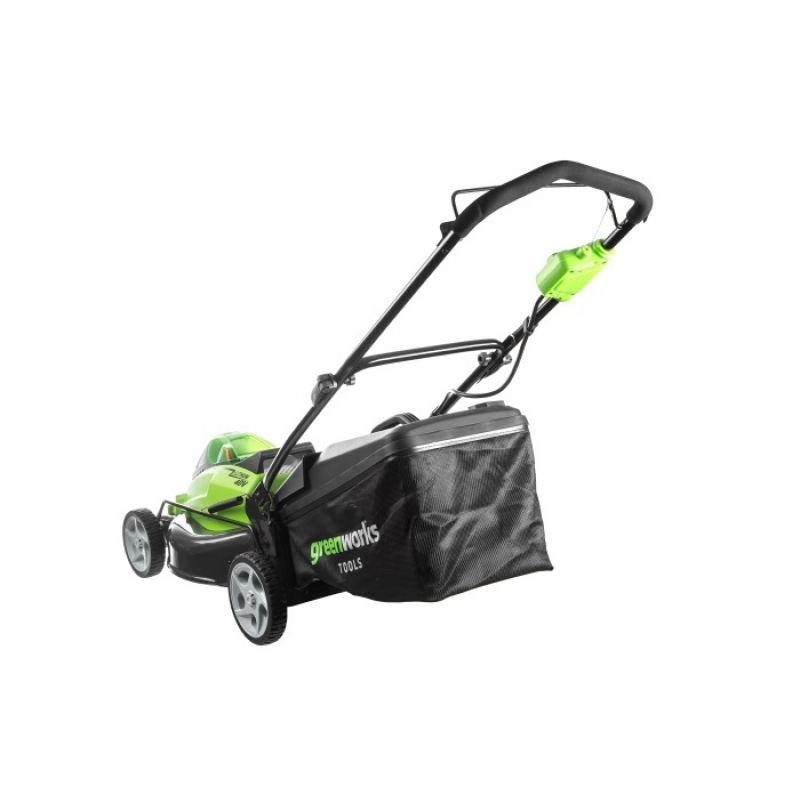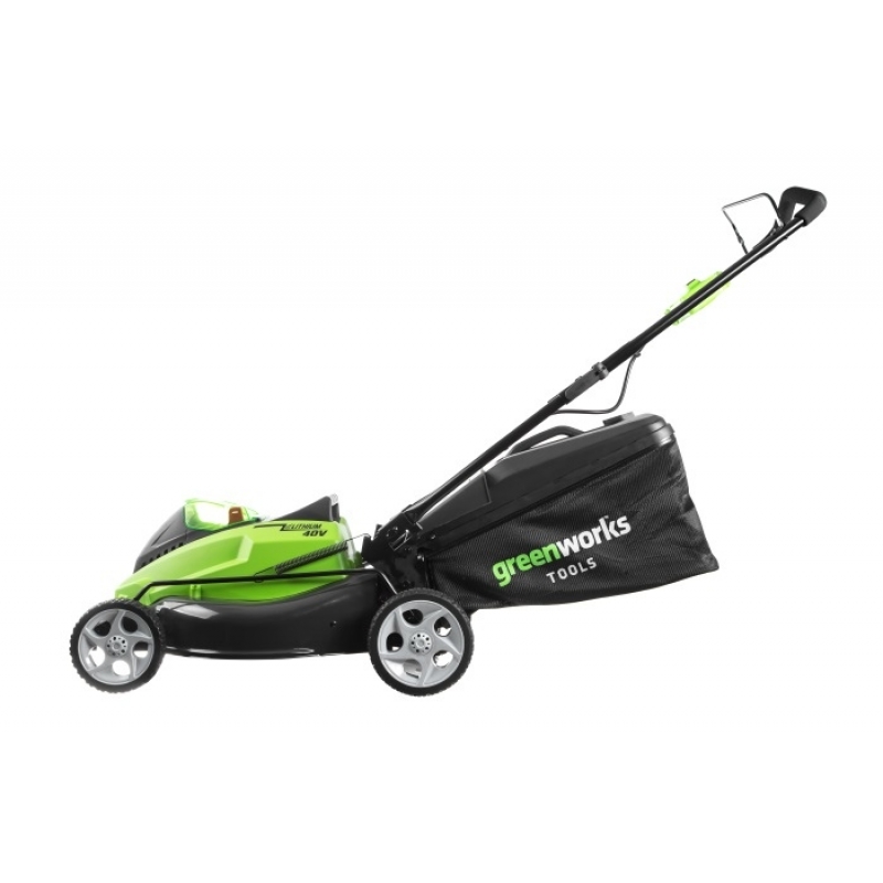Удобная рукоятка. 7” передние, 10” задние колёса позволят комфортно управлять газонокосилкой. Рама газонокосилки имеет складную конструкцию, для удобства транспортировки и хранения. Эта модель моментально готова к работе нажатием одной кнопки. Благодаря питанию от 40V аккумулятора газонокосилка обеспечивает долгую автономную работу. Данный аккумулятор совместим с другими устройствами из линейки G-MAX 40V. Для безопасной работы газонокосилка оснащена ключом безопасности.