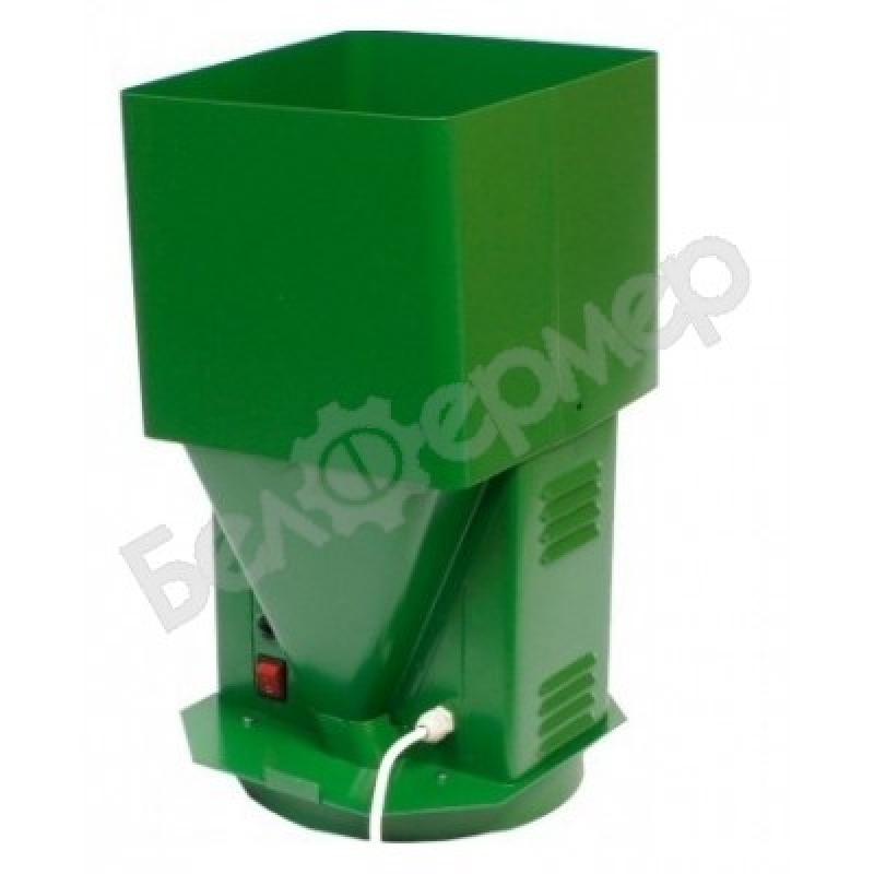 Корпус измельчителя полностью выполнен из металла и качественно окрашен порошковой эмалью, которая препятствует появлению коррозии. Объем загрузочного бункера составляет 16л. Подача зерна регулируется специальной заслонкой, расположенной в нижней части измельчителя.