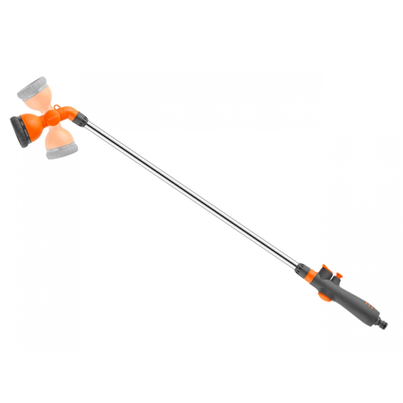 Предназначен для полива кустарников и других высоких растений. Головка распылителя поворачивается на 180° в вертикальной плоскости. Рукоятка пистолета-распылителя имеет регулятор напора водяного потока и фиксатор для продолжительного непрерывного полива. 1. center - центр, 2. mist - водяная пыль, 3. shower - душ, 4. angle - орошение под углом, 5. full - сильная струя, 6. soaker - прямая струя, 7. jet - прямая струя малого диаметра, 8. circle - круговая струя, 9. flat - плоская струя.