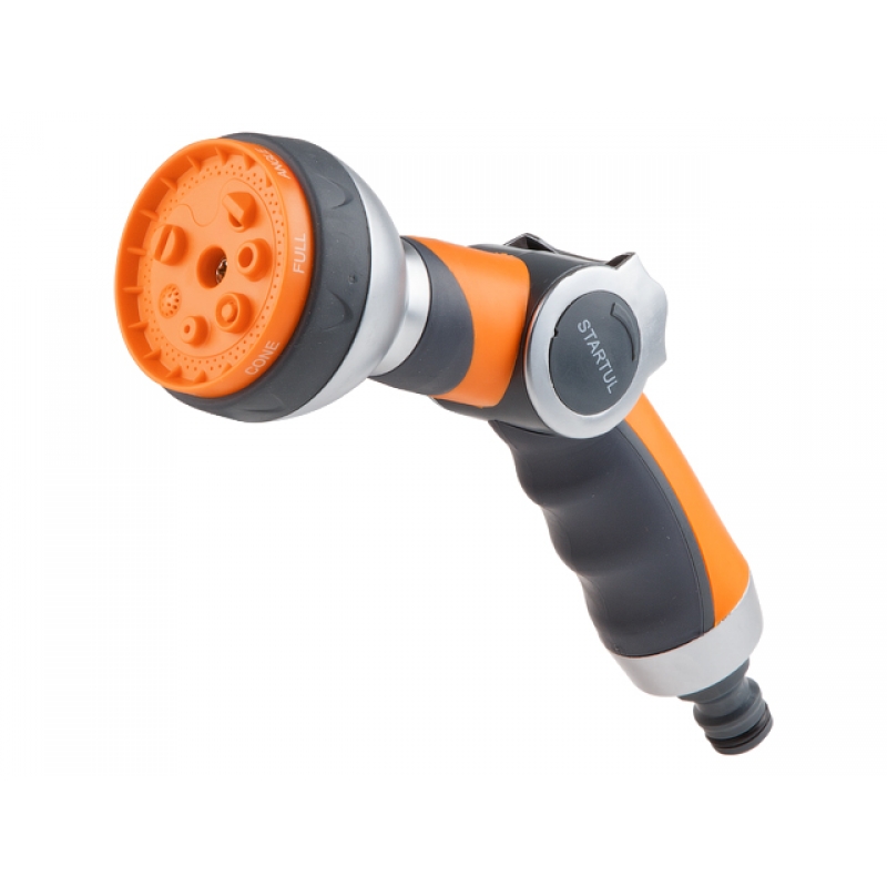 Надежный металлический каркас, предусмотрен механизм плавной регулировки расхода воды до полного перекрытия. 7 режимов полива: 1. center - центр, 2. mist - водяная пыль, 3.