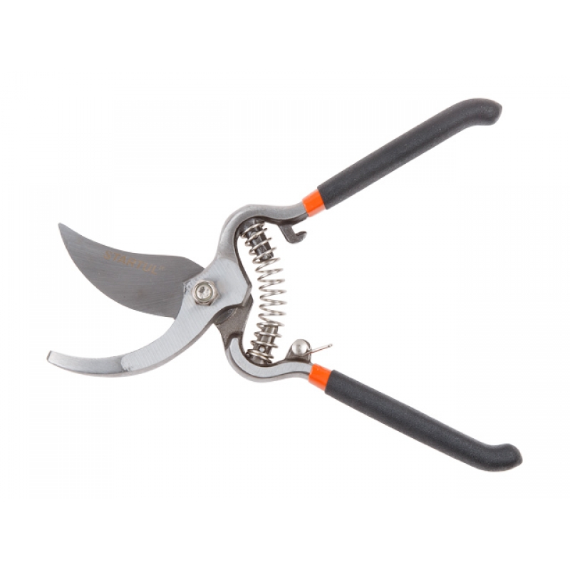 Описание: секатор с коваными изогнутыми лезвиями, представляющими собой единое целое с рукоятками, и фиксатором в виде крючка. Секатор целиком изготовлен из легированной стали, лезвия дополнительно закалены и остро заточены;